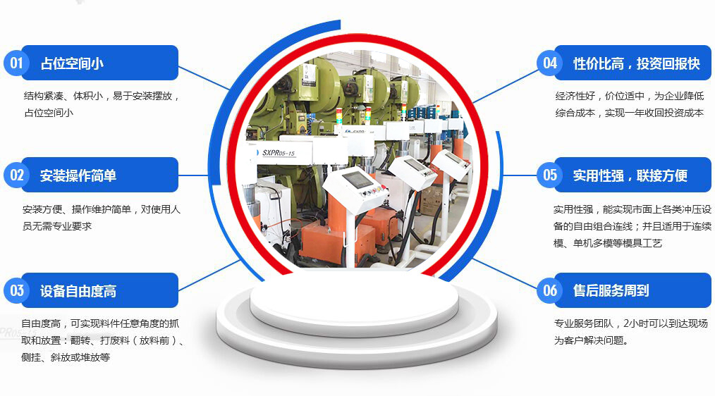 冲压机械手占位空间小,安装方便、操作维护简单,自由度高:可实现料件任意角度的抓取和放置,实用性强:能实现市面上各类冲压设备的自由组合联线,产品具有高可靠性,交货期短,高性价比的优势。